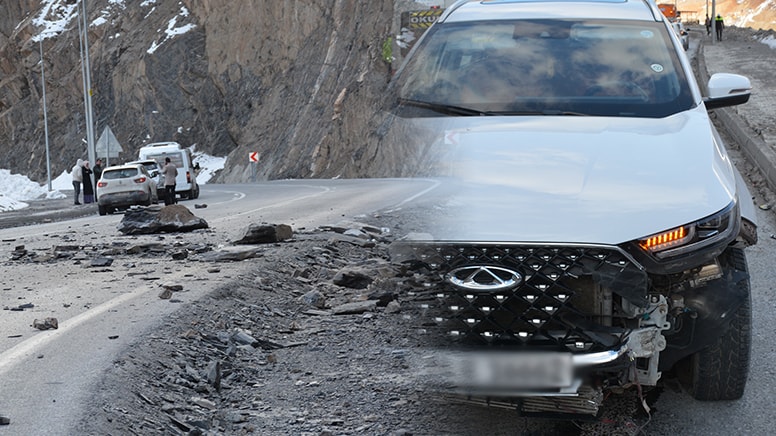 Sürücüsü öğrenilemeyen Irak plakalı otomobile, Hakkari-Van kara yolunun Depin mevkisinde seyir halindeyken dağdan kopan kaya isabet etti.