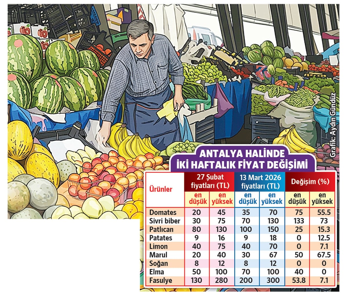 Fiyatlara bakıldığında ise 27 Şubat tarihinde 45 lira olan domates fiyatı 13 Mart itibarıyla 70 liraya, 75 lira olan sivri biber fiyatı 130 liraya, 130 lira olan patlıcan fiyatı ise 150 liraya ulaştı. Tavşan, geçen haftalarda meydana gelen sert hava koşulları ve sel gibi olayların mahsulü bir miktar etkilediğine dikkat çekerek, domates ve sivri biberde fiyat artışlarının yaşandığını ancak burada temel etkinin savaştan değil ramazan ayı ile ilgili arz talep dengesinden kaynaklandığını belirtti.