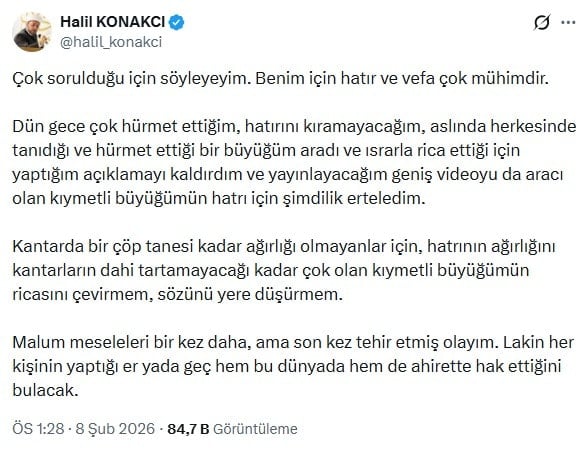 Ardından yeni bir açıklama yapan Konakçı, “Dün gece çok hürmet ettiğim, hatırını kıramayacağım ve herkesin tanıdığı bir büyüğüm aradı. Israrla rica ettiği için yaptığım açıklamayı kaldırdım” ifadelerini kullandı.