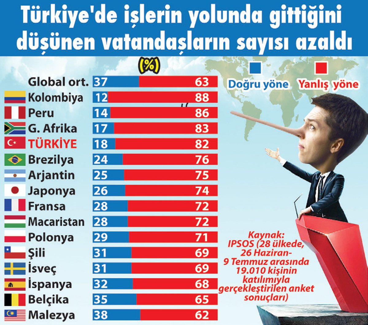 Global araştırma şirketi Ipsos’un 28 ülkede insanların endişelerini ortaya koymak üzere yaptığı son araştırma, Türkiye’de vatandaşların yüzde 82’sinin ülkede işlerin yanlış yöne gittiğini düşündüğünü ortaya koydu. Şubat ayında yapılan araştırmada halkın yüzde 65’i işlerin yanlış gittiğini söylemişti. Türkiye bu oranla Kolombiya, Peru ve Güney Afrika’nın ardından halkının ülke yönetimi konusunda endişelendiği dördüncü ülke oldu. Kolombiya yüzde 88’le ilk sırada gelirken, onu Peru yüzde 86, Güney Afrika da yüzde 83’le izledi. Böylece Türkiye, 5 ayda 5 basamak birden yükselmiş oldu. Şubat ayında Türkiye, 9’uncu sırada yer alıyordu.