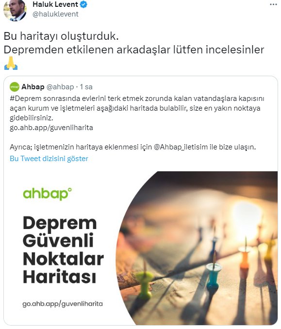 Sanatçı ve Ahbap Derneği'nin kurucusu Haluk Levent, Twitter hesabından Ahbap arama kurtarmanın ve kendisinin deprem bölgesine gideceğini duyurdu: