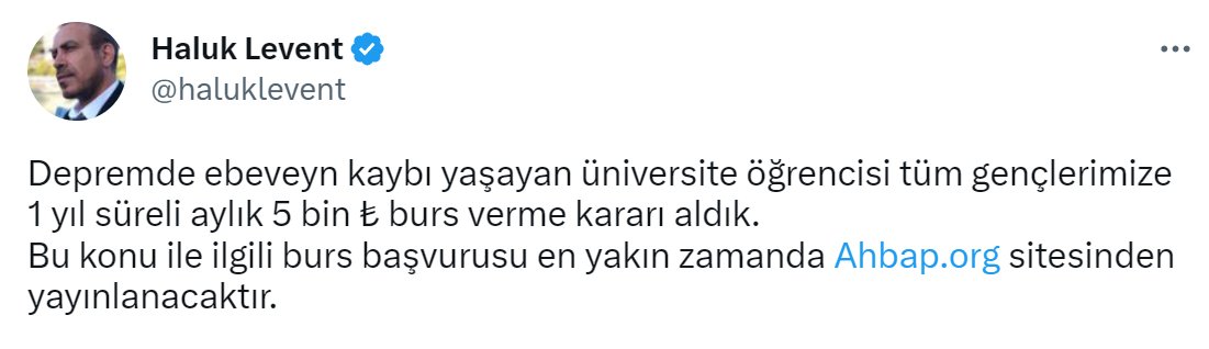 "Depremde ebeveyn kaybı yaşayan üniversite öğrencisi tüm gençlerimize 1 yıl süreli aylık 5 bin lira burs verme kararı aldık. Bu konu ile ilgili burs başvurusu en yakın zamanda Ahbap.org sitesinden yayınlanacaktır."
