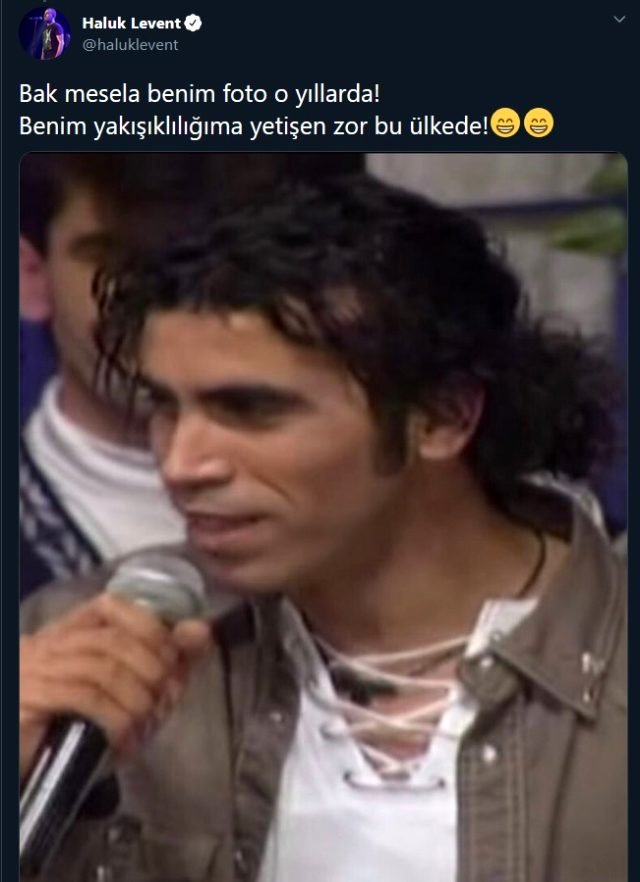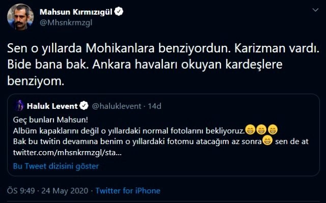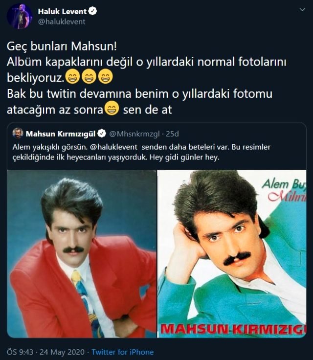 Kırmızıgül'ün bu paylaşımına Haluk Levent'ten yanıt gecikmedi. Levent de "'Geç bunları Mahsun!' Albüm kapaklarını değil o yıllardaki normal fotolarını bekliyoruz. Bak bu twitin devamına benim o yıllardaki fotomu atacağım az sonra, sen de at" diye yazdı ve gençlik fotoğrafını koydu.