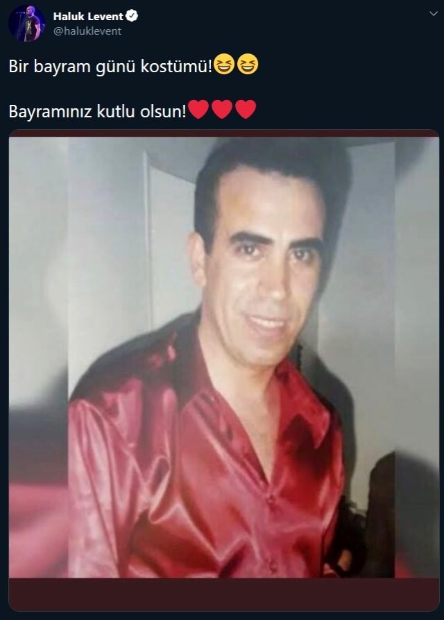 AHBAP Derneği'nin kurucusu ve yöneticisi Haluk Levent, Twitter hesabından, "Bir bayram günü kostümü! Bayramınız kutlu olsun" ifadeleriyle hem Ramazan Bayramını kutladı hem de geçmiş yıllara ait bir fotoğrafını paylaştı.