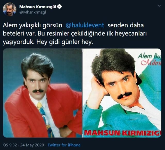Yıllar öncesine ait albüm fotoğraflarını Twitter'dan paylaşan Mahsun Kırmızıgül, "Alem yakışıklı görsün. @haluklevent senden daha beterleri var. Bu resimler çekildiğinde ilk heyecanları yaşıyorduk. Hey gidi günler hey" ifadelerini kullandı.