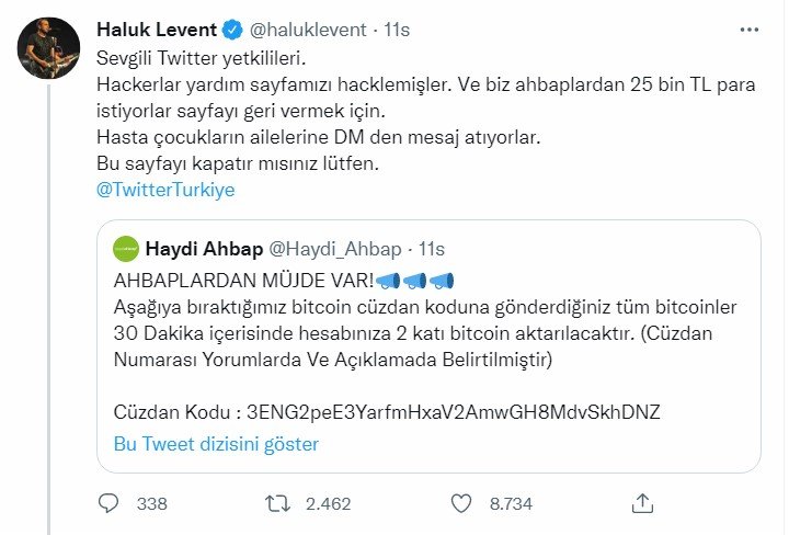 AHBAP Derneği'yle Türkiye'nin dört bir yanında ihtiyacı olanlara destek veren sanatçı Haluk Levent'i şoke eden olay! AHBAP'ın resmi Twitter hesabının çalındığını duyuran Levent, şu açıklamayı yaptı: