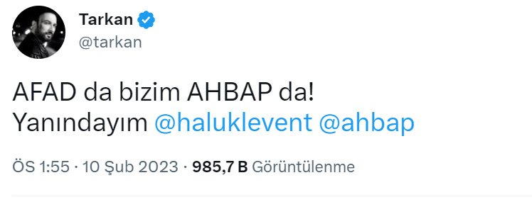 Sanatçı Tarkan da mesajında '"AFAD da bizim AHBAP da! Yanındayım @haluklevent @ahbap'' dedi.