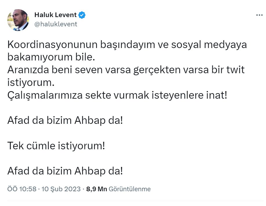 İlk günden itibaren deprem bölgeleri için çalışma başlatan Ahbap Derneği'nin kurucusu, şarkıcı Haluk Levent ise bazı kesimlerce hedef gösterilmesinin ardından Twitter hesabından sevenlerine şu çağrıda bulundu: