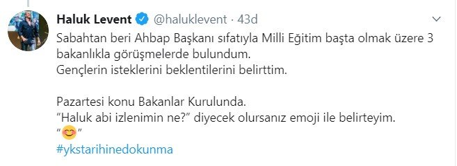 Konuyla ilgili sosyal medyadan bir açıklama yapan Levent, "Sabahtan beri AHBAP Başkanı sıfatıyla Milli Eğitim başta olmak üzere 3 bakanlıkla görüşmelerde bulundum. Gençlerin isteklerini beklentilerini belirttim.