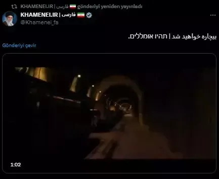 İran tarafından İsrail'e balistik füze saldırılarının yeniden başlatıldığı sırada İran dini lideri Ayetullah Ali Hamaney'in sosyal medya hesabından dikkat çeken bir paylaşım yapıldı. Videolu paylaşımda, Tahran'dan Tel Aviv'e fırlatılan füzelerin görüntüleri yer aldı. Mesajda, İbranice ve Farsça "Çaresiz kalacaksınız" ifadesine yer verildi.