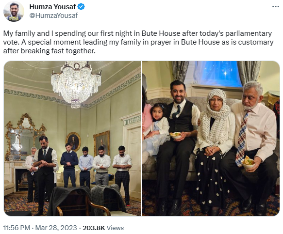 Yusuf, Twitter hesabından yaptığı paylaşımda, "Ailem ve ben bugün (28 Mart) parlamentoda yapılan oylamanın ardından Bute House'daki ilk gecemizi geçiriyoruz. Birlikte iftardan sonra adet olduğu üzere aileme namaz kıldırdığım özel bir an." ifadelerini kullandı.
