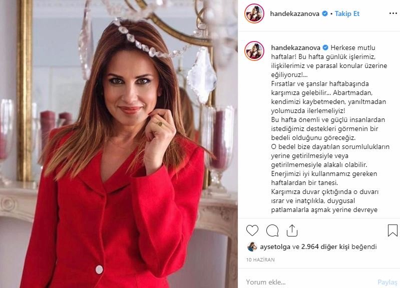 Hande Kazanova, sosyal medya hesaplarından burç yorumlarını paylaşıyor.