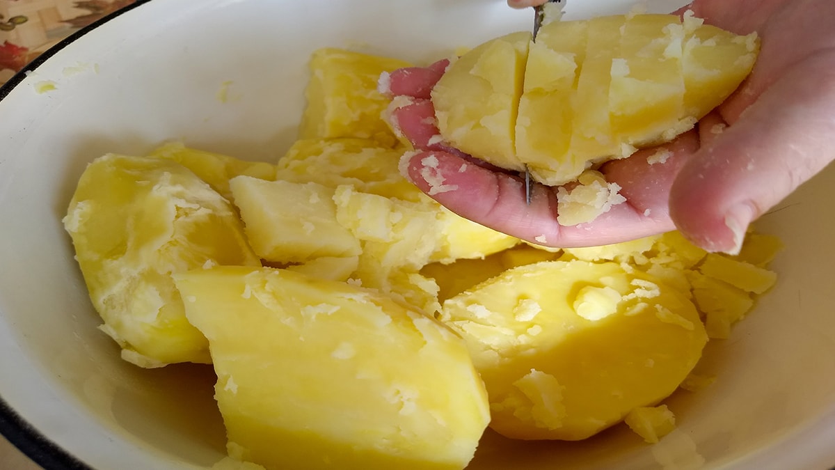 Patatesleri haşlamadan önce, her birinin üzerine küçük bir çentik atmak, haşlandıktan sonra kabukların daha kolay soyulmasına olanak sağlar.