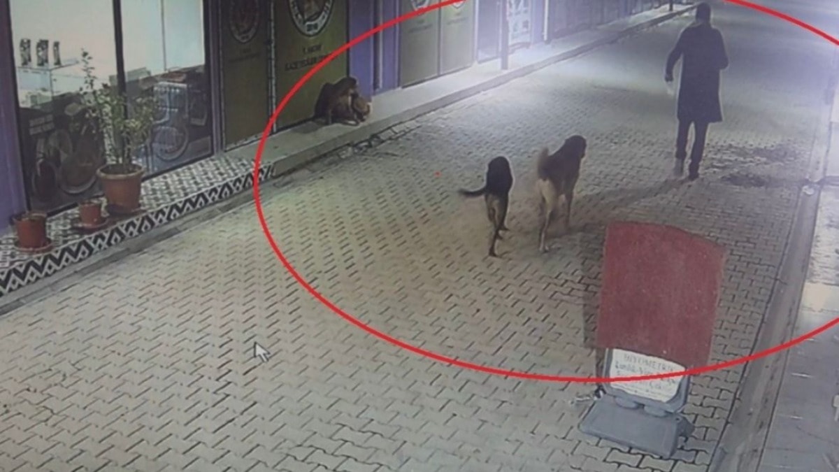 Görüntülerde, kimliği belirsiz bir kişinin yanında 3 sokak köpeğiyle çarşıda dolaştığı tespit edildi.