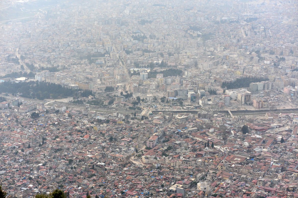 Binlerce iş makinesi ve kamyon ile enkaz kaldırma çalışmalarının gün boyu sürdürüldüğü Hatay'ın üzeri ise toz bulutuyla kaplandı.