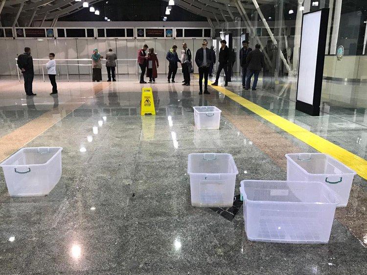 Hatay’da gün boyu etkili olan sağanak yağışın ardından, Hatay Havalimanı sular altında kaldı. Havaalanı çatısından akan suya, havaalanı personeli plastik kutulu önlem aldı. Plastik kutuları yan yana yerleştirerek, çatıdan akan suların önüne geçilmeye çalışıldı.