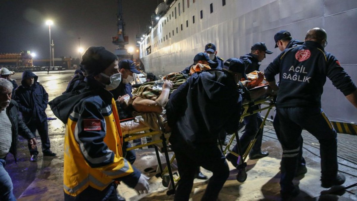 Limana ambulanslarla sevk edilen yaralılar, ekiplerce gemiye alınmaya başlandı.
