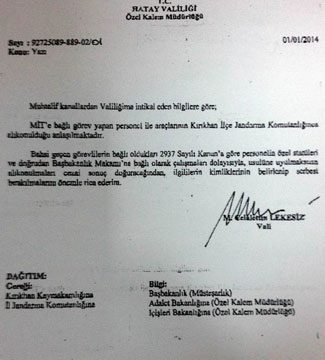 Dün Hatay'da jandarma tarafından yakalanan TIR ile ilgili Hatay Valisi Celalettin Lekesiz'in yazdığı talimat yazısı ortaya çıktı. Kırıkhan Kaymakamlığı ve Hatay İl Jandarma Komutanlığı'na gönderilen yazıda "MİT'e bağlı görev yapan personel ile araçlarının Kırıkhan İlçe Jandarma Komutanlığınca alıkonulduğu anlaşılmaktadır" ifadeleri yazılı.