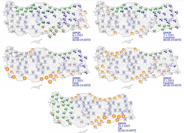 Meteoroloji Genel Müdürlüğü tarafından yapılan son değerlendirmelere göre: Marmara'nın doğusu, Doğu Akdeniz'in doğusu, İç Anadolu'nun kuzey ve doğusu, Karadeniz, Doğu Anadolu'nun kuzey ve batısı, Güneydoğu Anadolu ile Bitlis, Van, Muş ve Bingöl çevrelerinin yağmurlu, iç ve yüksek kesimlerde yer yer karla karışık yağmur ve kar yağışlı geçeceği tahmin ediliyor.