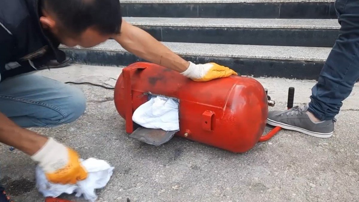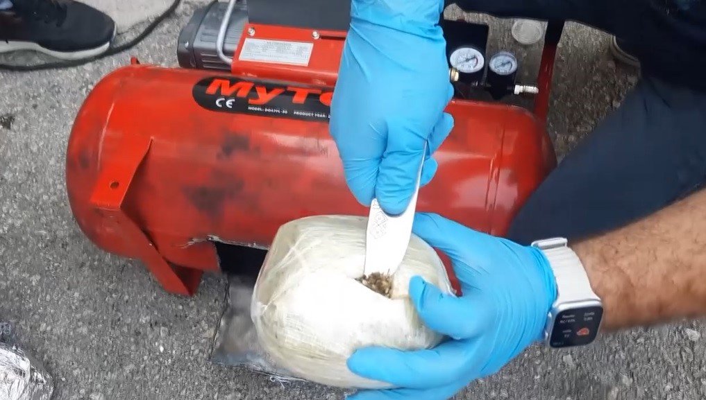 Narkotik köpeği ile yapılan incelemede kompresör makinesi görünümlü hava tüpünün alt tarafına kapak yapılmak suretiyle zulalanmış 4 paket halinde 2 kilo 94 gram esrar ele geçirildi.