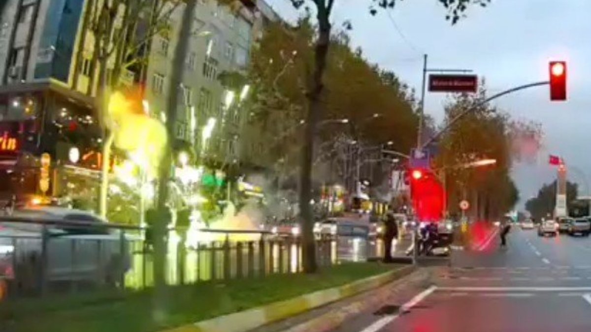Görüntülerde, caddede havai fişeklerin patlatılması, çevredeki vatandaşların ve caddeden geçen motosiklet sürücüsünün panikle kaçtığı görülüyor. (DHA)