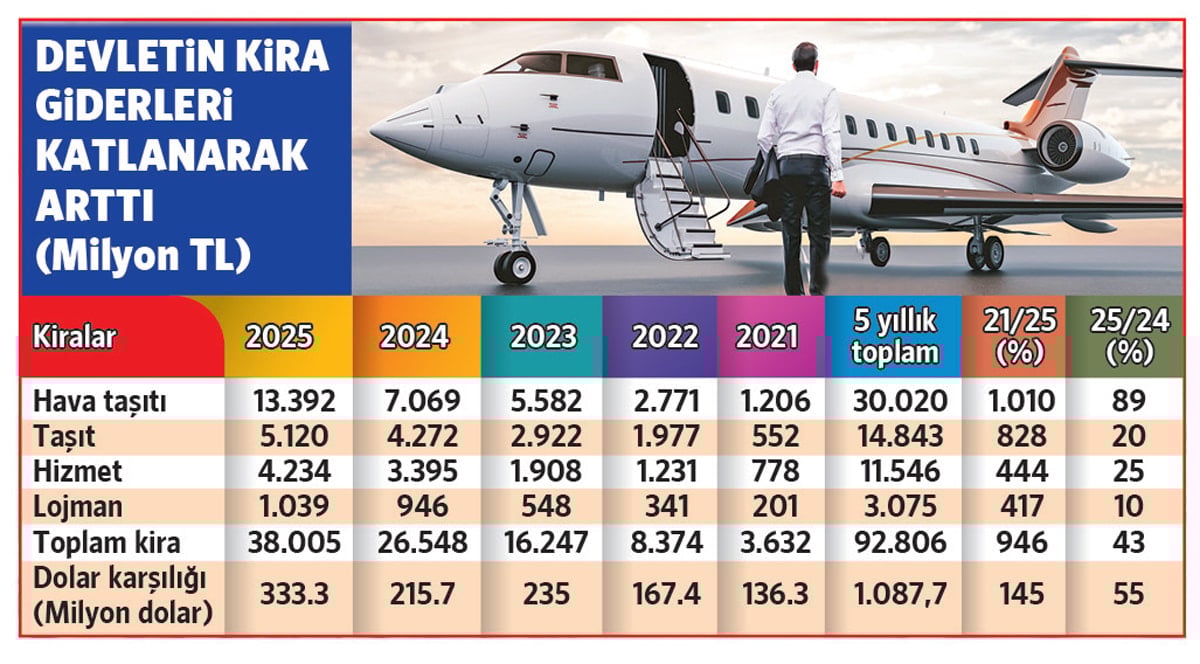 Kiralık hava saltanatına son 5 yılda akıtılan para da 30 milyar lirayı aştı. Hava taşıtlarına ödenen kira bedeli dolar bazında güncellendiğinde 47 milyar lirayı (1 milyar 88 milyon dolar) buluyor. Hazine ve Maliye Bakanlığı’nın resmi bütçe verilerine göre, 2025 yıl sonu itibarıyla devletin kira gideri 38 milyar lirayı aştı.