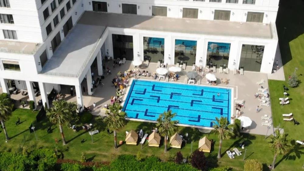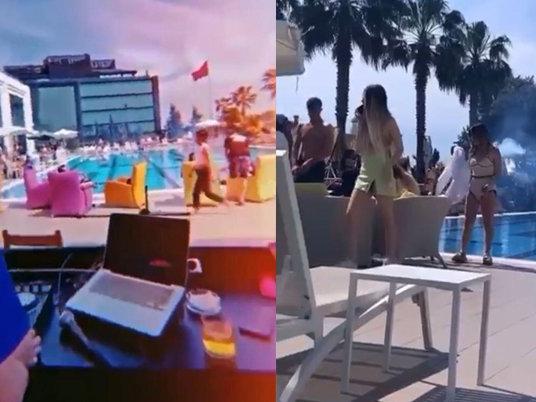 Sosyal mesafe ve maske kuralının hiçe sayıldığı etkinlikte otel müşterisi oldukları öğrenilen çok sayıda kişi görüntülere yansıdı. Görüntülerde otel çalışanlarının maske takarak servis yaptıkları, etkinliğe katılanların ise tedbirleri hiçe saydığı görüldü. (İHA)