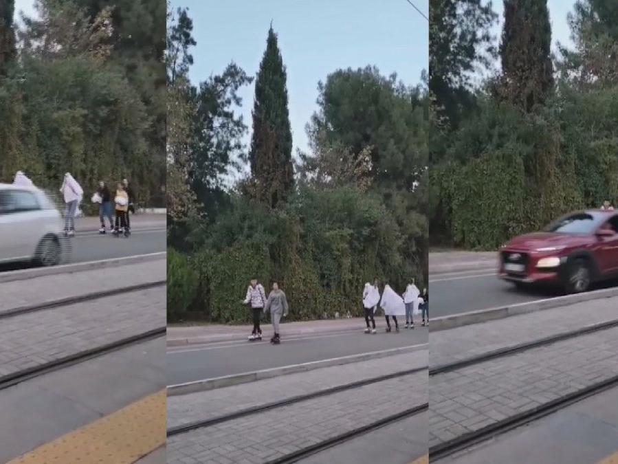 Muratpaşa ilçesi Bahçelievler Mahallesi Konyaaltı Caddesi üzerindeki ana yolda saat 18.00 sularında, hayalet kılığına giren patenci bir grup gencin tehlikeli yolculuğu çevredeki vatandaşların cep telefonu kamerasına yansıdı.