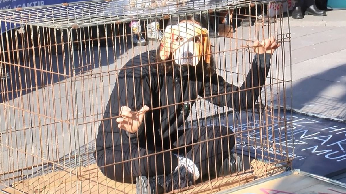 Konuşmaların ardından bir hayvansever, hayvanlara yönelik şiddete dikkat çekmek için köpek maskesi takarak bir süre kafeste bekledi. (DHA)