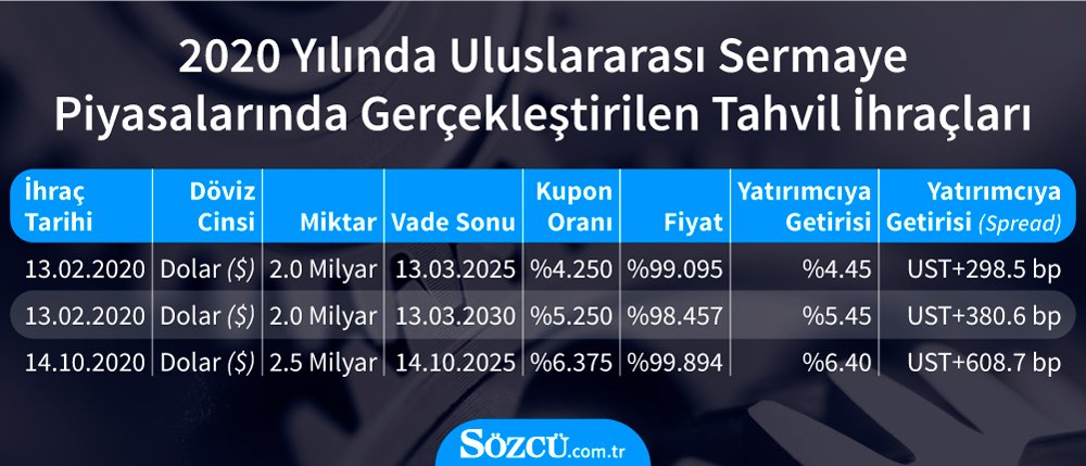 Bu tahvil ihracıyla birlikte 2020 yılında uluslararası sermaye piyasalarından toplam 6,5 milyar dolar borçlanılmış oldu.