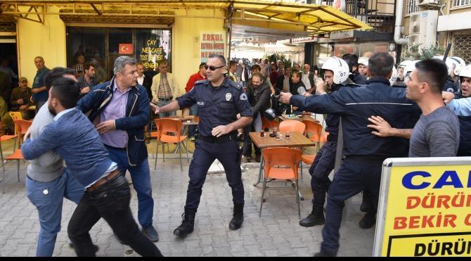 Polis, yürüyüşün kanunsuz olduğunu belirterek, gruba il binasına dönmesi uyarısında bulundu. İkazlara rağmen yürümek isteyen grubun önü, çevik kuvvet ekiplerince kesildi. Gruptakilerin yürümekte direnmesi üzerine biber gazıyla müdahale edildi. Ardından hazır bekletilen toplumsal olaylara müdahale aracından (TOMA) eylemcilere tazyikli su sıkıldı. Polis, eylemcilerden, aralarından HDP İl Eş Başkanı İhsan Nergiz'in de bulunduğu biri kadın 5 kişiyi gözaltına aldı. Diğer eylemciler ise müdahaleden sonra HDP İl binasına döndü. Polis, binanın çevresinde yoğun güvenlik önlemi alarak beklemeye başladı.