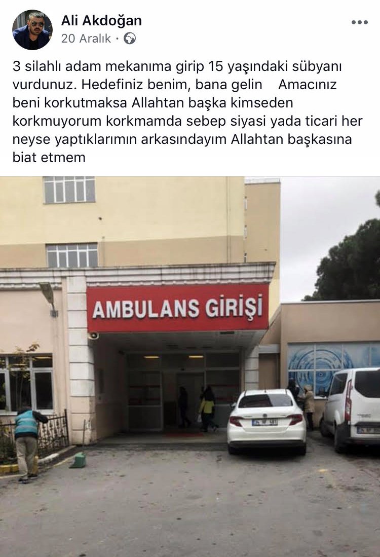 İşyerinin kurşunlanmasının ardından Ali Akdoğan’ın sosyal medya hesabından, “3 silahlı adam mekânıma girip 15 yaşındaki sübyanı vurdunuz. Hedefiniz benim, bana gelin. Amacınız beni korkutmaksa Allah’tan başka kimseden korkmuyorum. Sebep siyasi ya da ticari her ne ise yaptıklarımın arkasındayım Allah’tan başkasına biat etmem” paylaşımında bulunduğu ortaya çıktı.