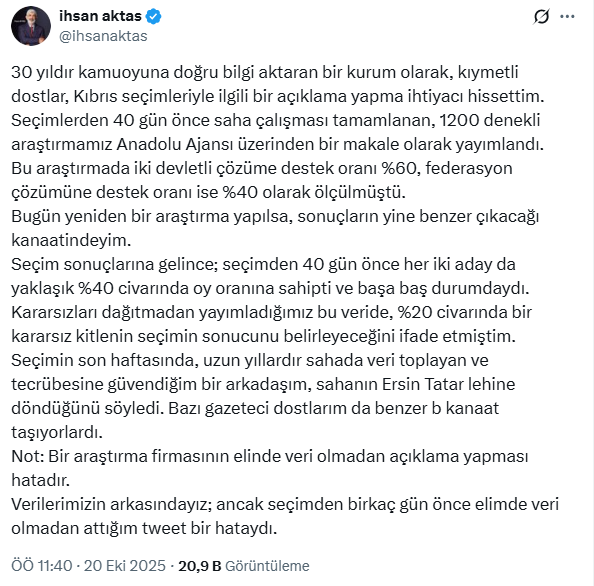 Aktaş paylaşımında, “Seçime bir ay kala Kıbrıs’ta yapmış olduğumuz araştırmada; 1-Ersin Tatar iki devletli çözümden yana destek %60. 2- Tufan Erhürman federasyon çözümünden yana destek %40. Bir ay önce hatırı sayılır bir kararsız seçmen kitlesi vardı. Yeni saha bilgilerine göre kararsızlar Ersin Tatar lehine tercih yapıyor" ifadelerini kullanırken şunları kaydetti: