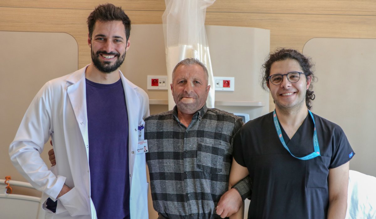 İsrafil Taşkın, Plastik Cerrahi Uzmanı Dr. Burak Ergün Tatar (sağda) ve Kulak Burun Boğaz Uzmanı Egehan Salepci (solda) ile poz verdi.DUDAK YARASI KANSER ÇIKTI