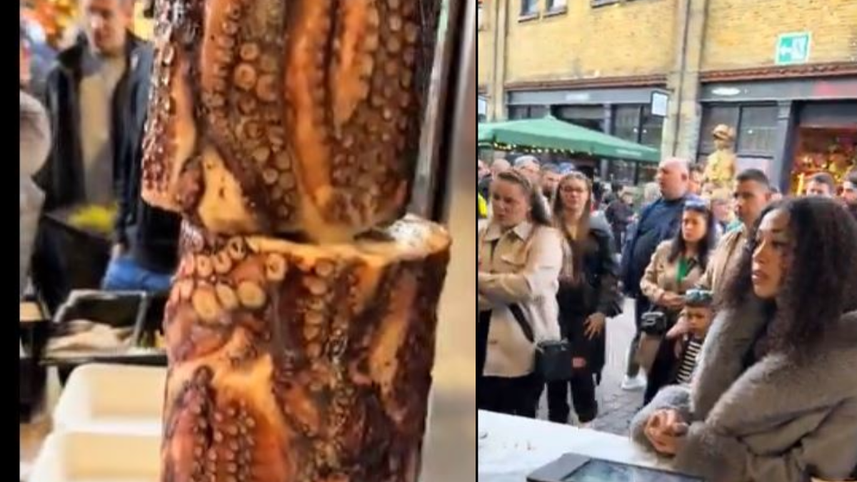 Deniz ürünleriyle döner konseptini birleştiren ahtapot döner, ustaların elinde lezzete dönüyor Ahtapot etini şişe geçirip geleneksel yöntemlerle pişiren ustalar daha sonra ince dilimler halinde keserek sunum yapıyor.