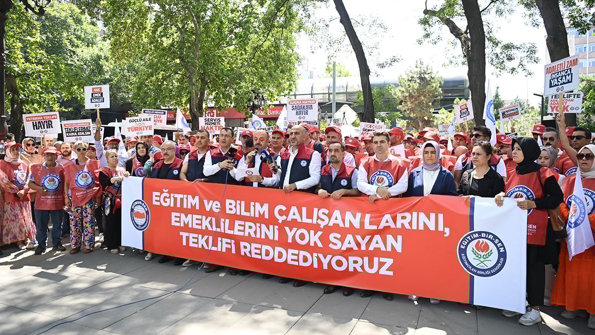 Ankara’da Mili Eğitim Bakanlığı önünde basın açıklaması yapan Eğitim Bir-Sen üyeleri, 1.5 milyon eğitim çalışanının hiçe sayıldığını vurguladı. Memurlar, yanlarında getirdikleri farklı boyutlardaki ekmeklerle iktidarın teklifini protesto etti. Eğitim Bir-Sen Genel Sekreteri Talat Yavuz, “Öğretmen ve eğitim çalışanları, emekli olmaktan korkuyor. Görev aylığı ile emekli aylığı arasında uçurum var. Bizleri emeğimizin değerinin bilindiği, alın terimizin karşılığının verildiği bir toplu sözleşme istiyoruz” diye konuştu.