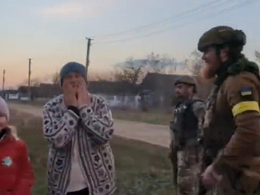 Görüntülerde, Herson merkezindeki idari binanın önünde toplanan onlarca kişinin Ukrayna askerlerine sevgi gösterisinde bulunduğu, birçok kişinin sevinç gözyaşlarını tutamadığı görülüyor.