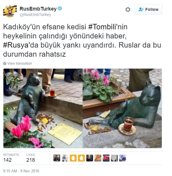 Büyükelçilik'in Twitter hesabından yapılan açıklamada "Kadıköy'ün efsane kedisi #Tombili'nin heykelinin çalındığı yönündeki haber, #Rusya'da büyük yankı uyandırdı. Ruslar da bu durumdan rahatsız" denildi.Rusya'da kedilere geleneksel olarak önem veriliyor. Sözgelimi kedi beslemenin ev halkına iyi şans getireceğine inanılıyor. Rusya'nın en ünlü müzesi olan Ermitaj da Çariçe Elizaveta döneminden yani 1700'lerden beri 'fare avcısı' yüzlerce kediye ev sahipliği yapıyor.