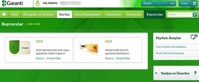 HGS abonelik başvuruları aynı zamanda online olarak da yapılabilir. Bu konuda Garanti Bankası’nın online bankacılık sistemi kullanılabilir. Bankacılık sistemine giriş yapıldığında ilk olarak başvurular bölümüne tıklanması ve ardından da HGS bölümünün seçilmesi gerekir. İlgili seçim yapıldıktan sonra aşağıdaki resimde görülen bir ekran görülür