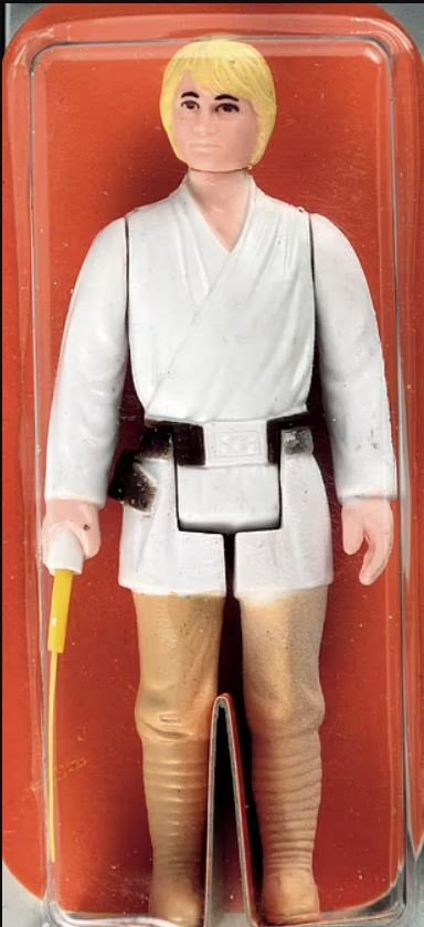 Hâlâ orijinal kapalı ambalajında olan figür, Skywalker'ın sağ kol yuvasından çıkan iki parçalı bir silah olan eski bir "çift teleskopik" ışın kılıcı tasarımına sahip. Hiç açılmamış olan bu örnek, Pennsylvania'daki Hake's Auctions'ta yer alıyor.