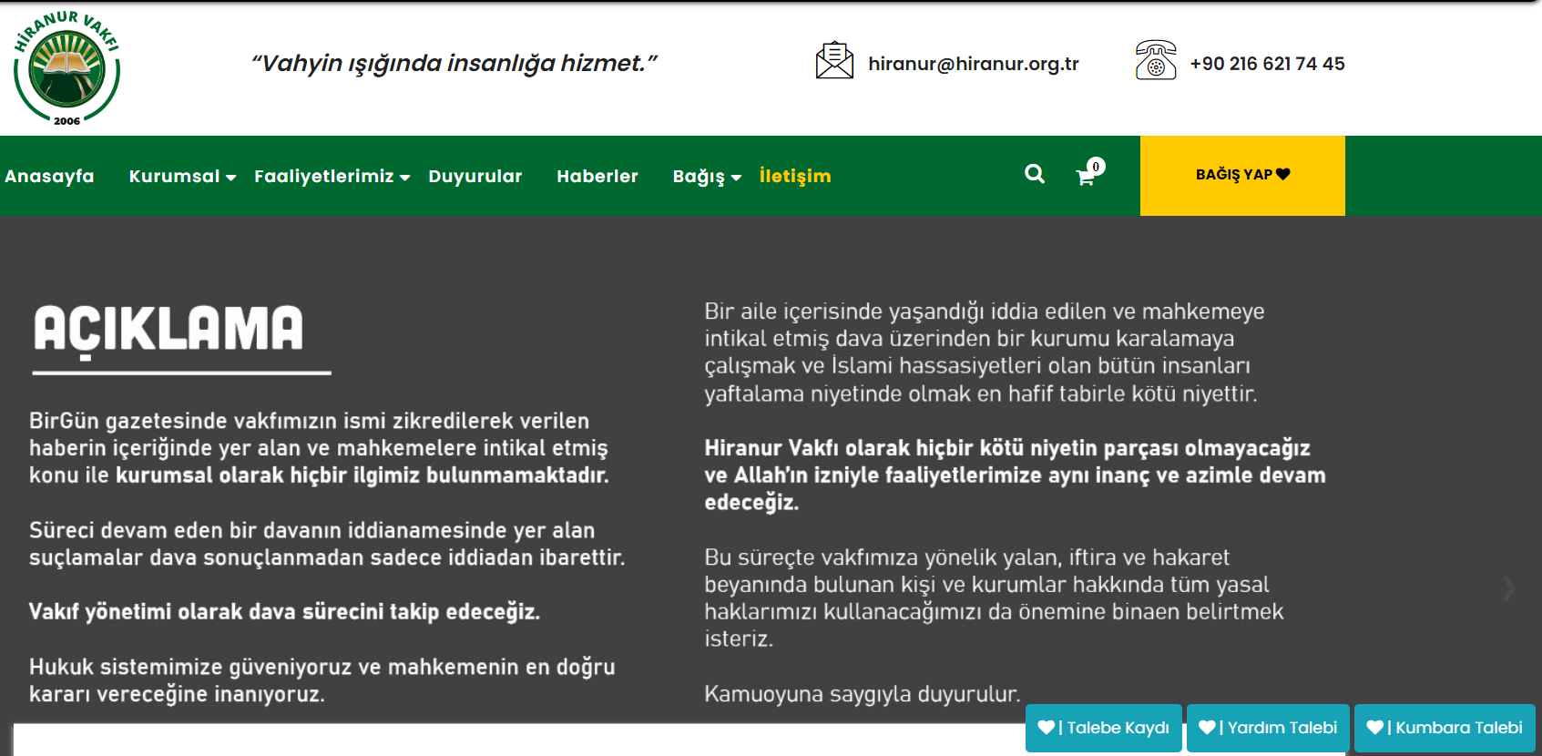 Birgün gazetesi tarafından gündeme getirilen haberle ilgili olarak üç gün önce Hiranur Vakfı'ndan bir açıklama yapılmıştı. Vakfın internet sitesinde yer alan açıklamada, "Mahkemelere intikal etmiş konuyla ilgili kurumsal olarak hiçbir ilgimiz bulunmamaktadır" denilmişti.