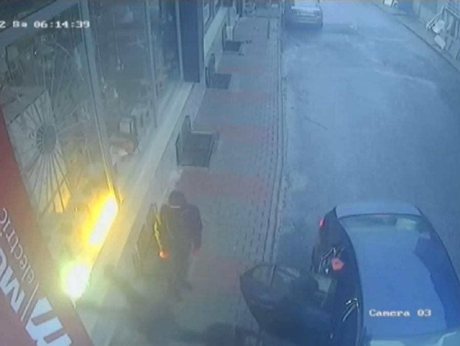 Şüpheliler, tam işyerinin camını kırmak için tekme atmaya başlamıştı ki, balkondan atılan eşyaların hedefi oldu.