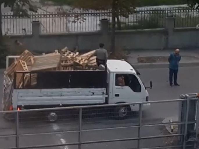 Tahta paletleri kamyonete yükleyen hırsızlar, çevredeki bir kişi tarafından fark edildi. Kamyonetin önüne geçerek, plakasını almaya çalışan kişinin üzerine kamyoneti süren hırsızlar, olay yerinden uzaklaştı. (DHA)