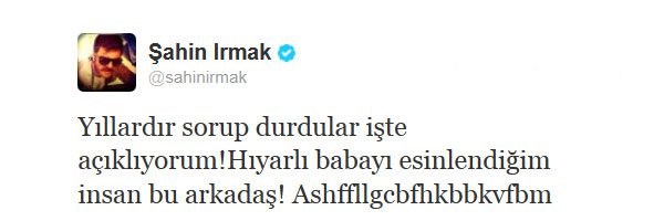 Son olarak Nurgül Yeşilçay'la Sultan dizisinde izlediğimiz Şahin Irmak, twitter hesabından takipçilerinin çok merak ettiği bir sorunun yanıtını paylaştı. BKM Mutfak'ta canlandırdığı Hıyarlı Baba karakterini kimden esinlendiğini açıklayan Irmak bu fotoğrafı paylaştı ve şu iletiyi yazdı.