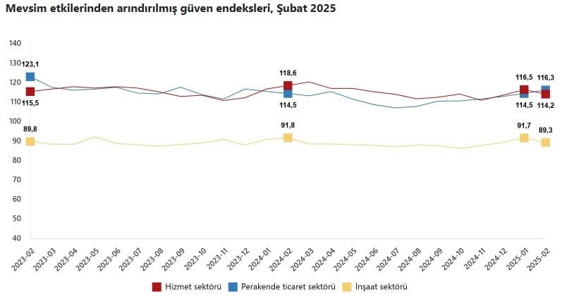 Mevsim etkilerinden arındırılmış güven endeksleri, Şubat 2025