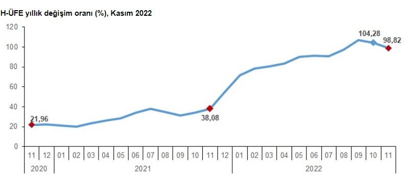 Buna göre, 2022 yılı Kasım ayında H-ÜFE bir önceki aya göre yüzde 0,25, bir önceki yılın Aralık ayına göre yüzde 76,24, bir önceki yılın aynı ayına göre yüzde 98,82 ve on iki aylık ortalamalara göre yüzde 88,69 arttı.