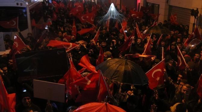 HOLLANDA Başkonsolosluğu önünde toplanan vatandaşlar protesto eylemi gerçekleştiriyor. Türk bayraklarıyla konsolosluk önünde toplanan vatandaşlar Hollanda aleyhine slogan atıyor. Çevik Kuvvet ekipleri ve Özel Harekat polisleri de giriş çıkışa kapatılan konsolosluk önünde geniş güvenlik önlemi aldı. AK Parti Milletvekili Metin Külünk de burada yaptığı konuşmada, Bugün görüyoruz ki Avrupa bu değerlerin hepsinde sınıfta kalmıştır. Bugün Avrupa'da nazizmin kendisi vardır. Bugün Avrupa'da ırkçı faşizmin kendisi vardır. Bugün Hollanda siyasetinin tükenmişliği vardır. Türk halkı buna diplomatik ölçüde, demokrasinin sınırları içinde misliyle cevap vercektir" dedi. Vatandaşların eylemi devam ediyor.