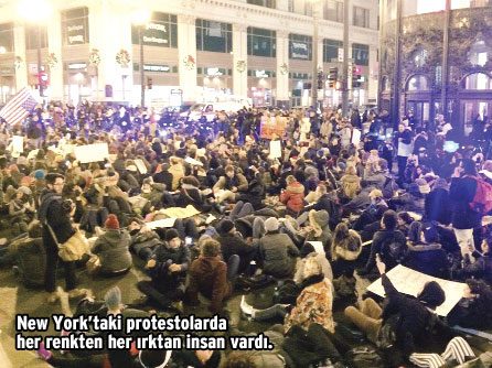 Geçen hafta Manhattan‘da yine protesto yürüyüşleri vardı. Protestocuların değimiyle halk köprüleri ele geçirdi. Birbirinden bağımsız gruplar yürüyüşe geçip belli meydanlarda toplandı ve adalet için slogan attı.