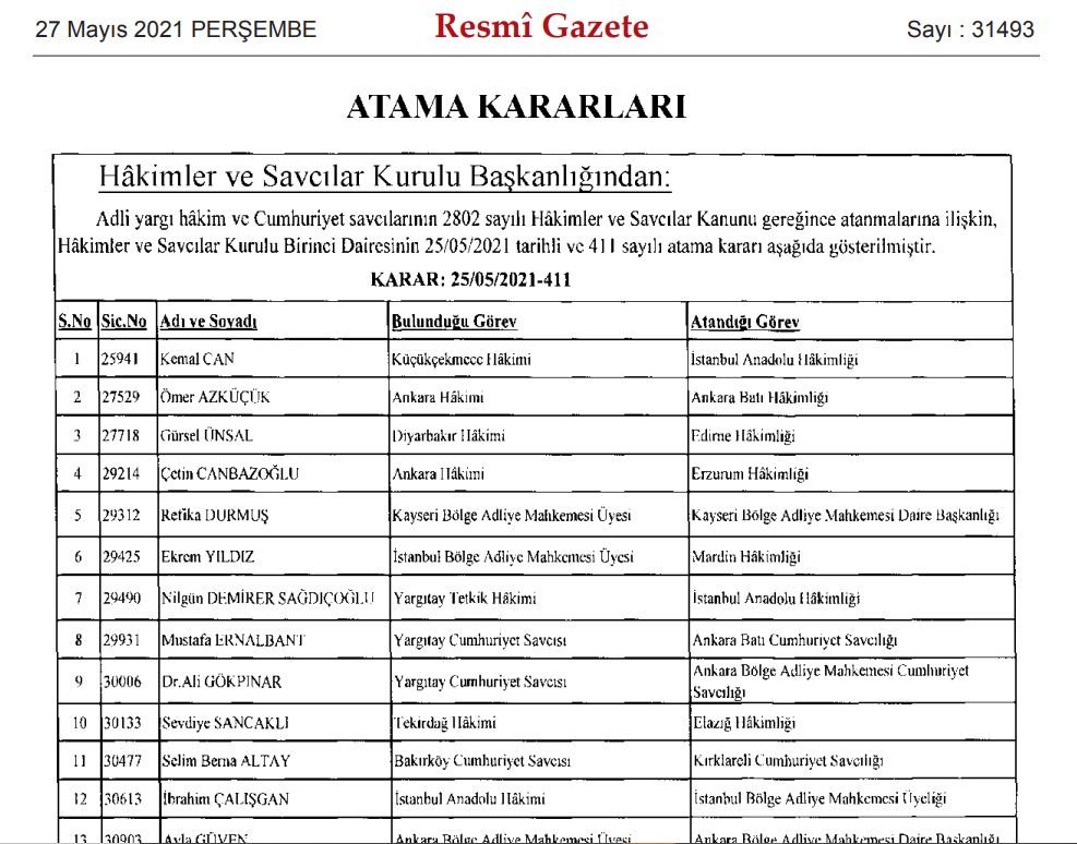 Öte yandan Hakimler ve Savcılar Kurulu Birinci Dairesi'nin 25 Mayıs 2021 tarihli, 2582 "Adli Yargı hakim ve Cumhuriyet savcısı ve 488 'İdari yargı hakim ve savcısının atama kararı da Resmi Gazete'de yayımlandı. Kararla toplam 3 bin 70 hakim ve savcının yeni görev yerleri belirlendi.