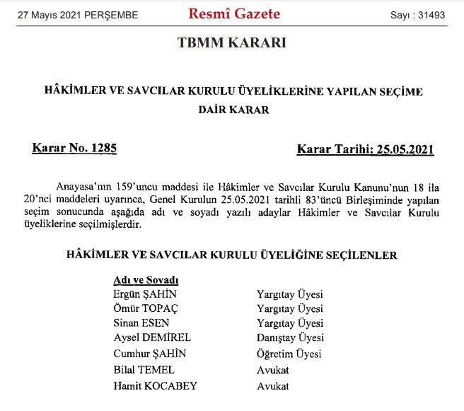 Türkiye Büyük Millet Meclisi'nde 25 Mayıs günü toplanan Genel Kurul tarafından yapılan seçim sonucunda HSK üyeliğine seçilen isimler ise şöyle: